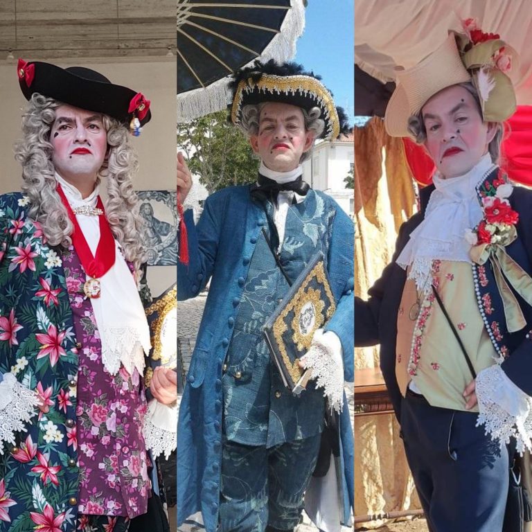 He walks through centuries, telling stories with powdered cheeks and lace.
